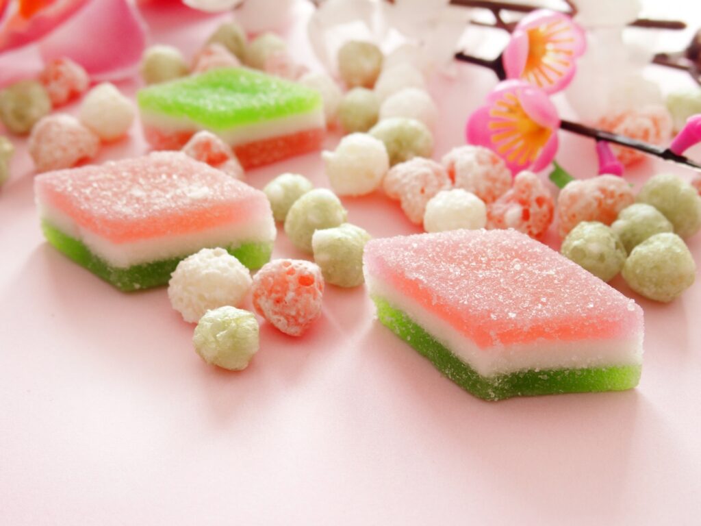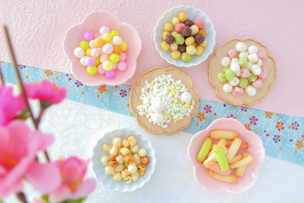 小さな色付きのあられで、地域によって甘いタイプ(主に関東)や塩・醤油味(関西)があり、味わいにも違いがあります。色には意味が込められ、桃・白・緑(または黄を含む四色)は四季や一年を通じた幸せ・健康を象徴するとされます。ひなあられは元々は菱餅を崩して持ち出し、野外で食べたことが起源とも言われています。