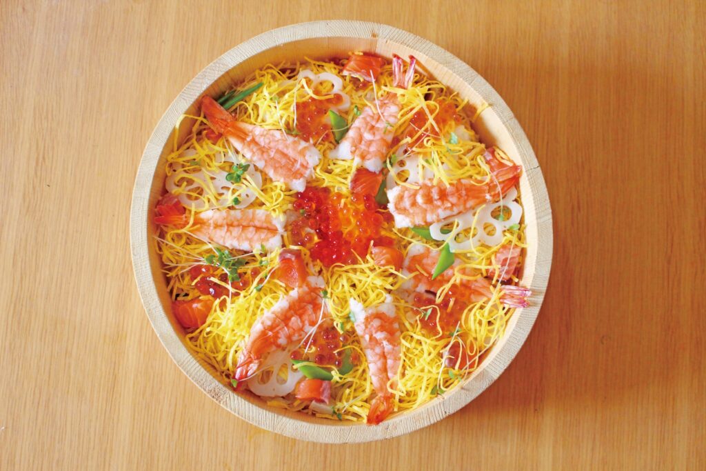 ひな祭りを代表する祝いの料理で、酢飯の上にエビやれんこん、錦糸卵など色とりどりの具材を散らした寿司です。江戸時代に祝いの席の料理として好まれ、大正時代以降にひな祭りの定番料理として定着しました。色鮮やかな見た目と具材で「祝う心」を表します。